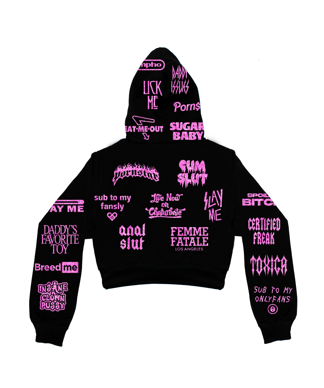 ALL OVER HOLOGRAPHIC METAL + SPARKLE PRINT ON A BLACK CROPPED HOODIE + THONG