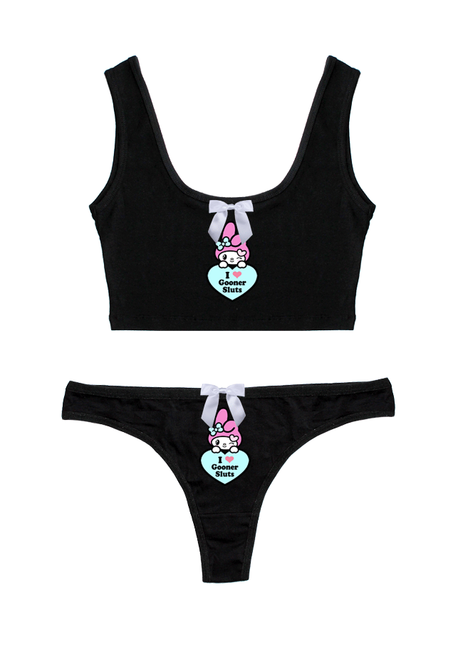 LOGO PRINT ON A CROPPED SCOOP NECK TOP WITH BOWS + MATCHING CHEEKY THONG WITH BOWS